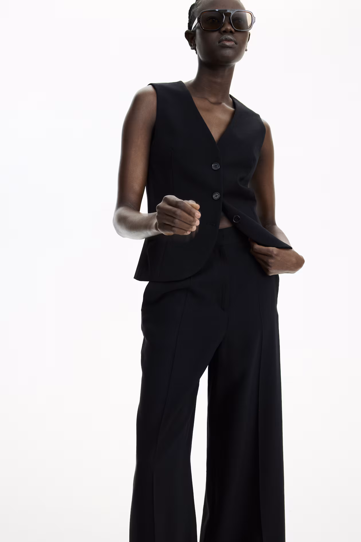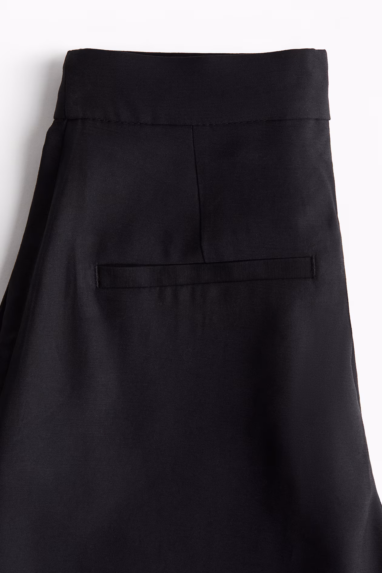 Pants in a woven viscose blend. High waist, zip fly with concealed button and hook-and-bar fasteners, diagonal side pockets, and mock welt back pockets. Wide legs with creases at front and back.