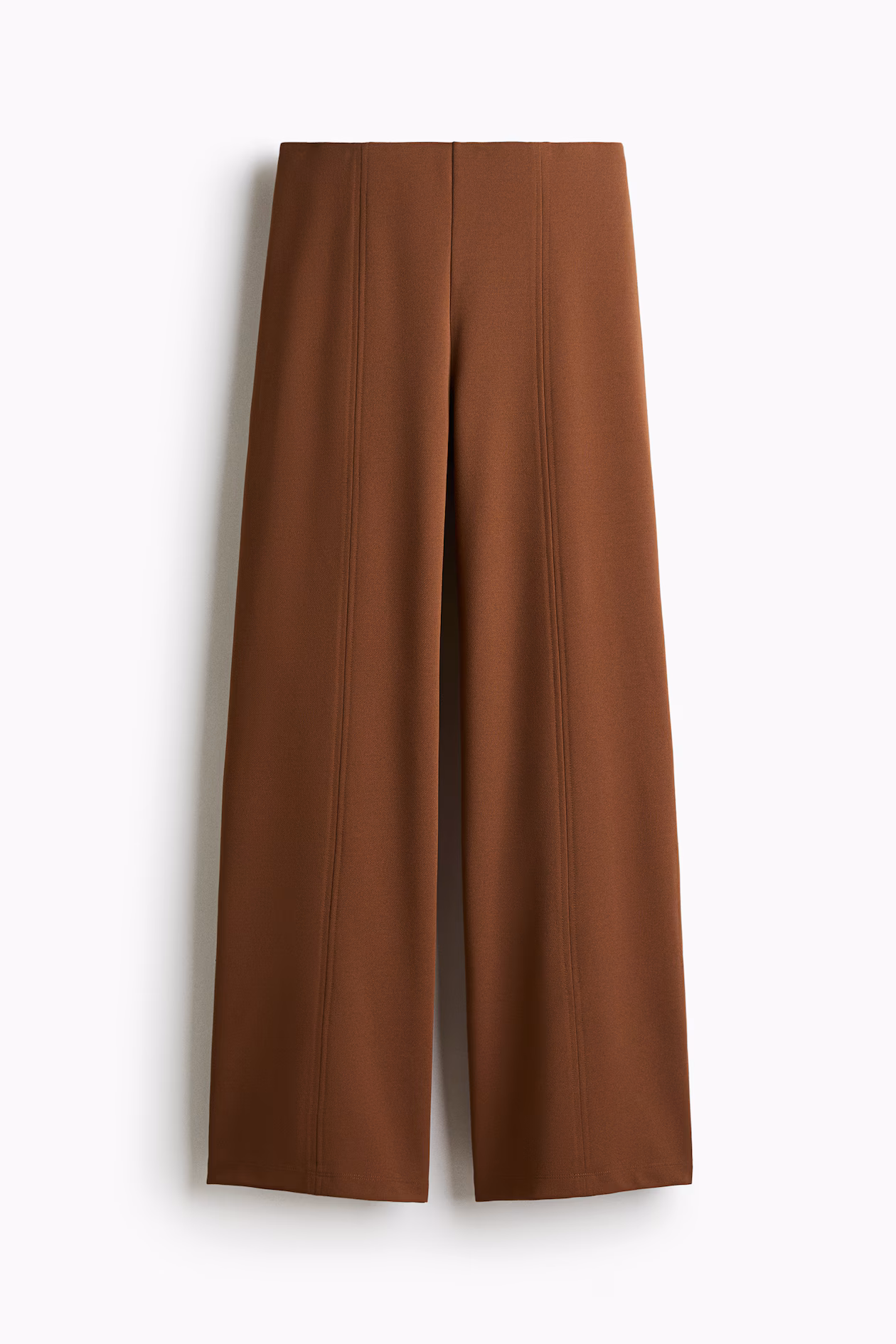 Pants in softly draped stretch jersey, with double, vertical top-stitched seams at front of legs. High waist, concealed, elasticized waistband, and wide legs.