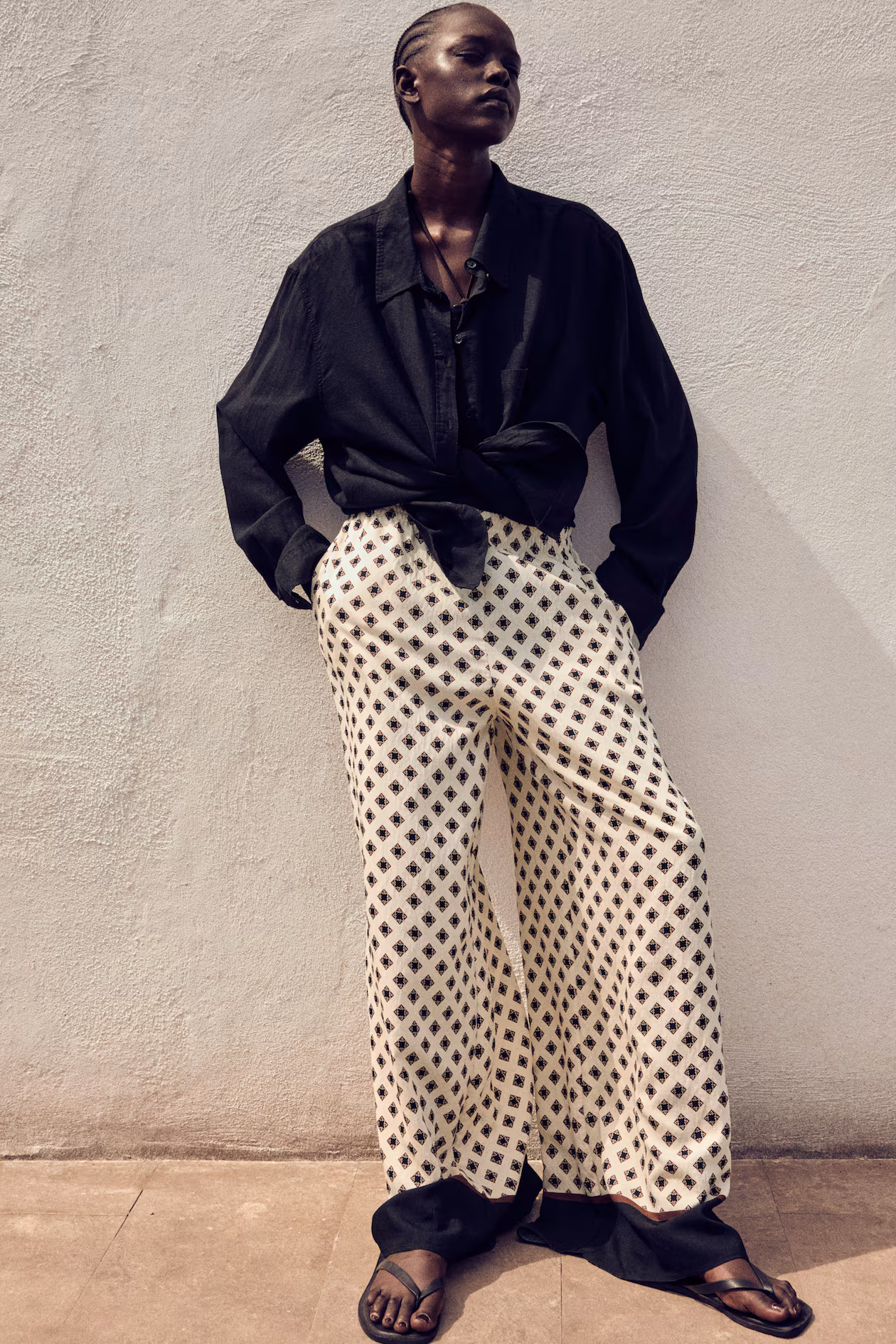 Loose-fit pants in woven fabric. High waist, elasticized waistband, and discreet side pockets. Wide legs.
