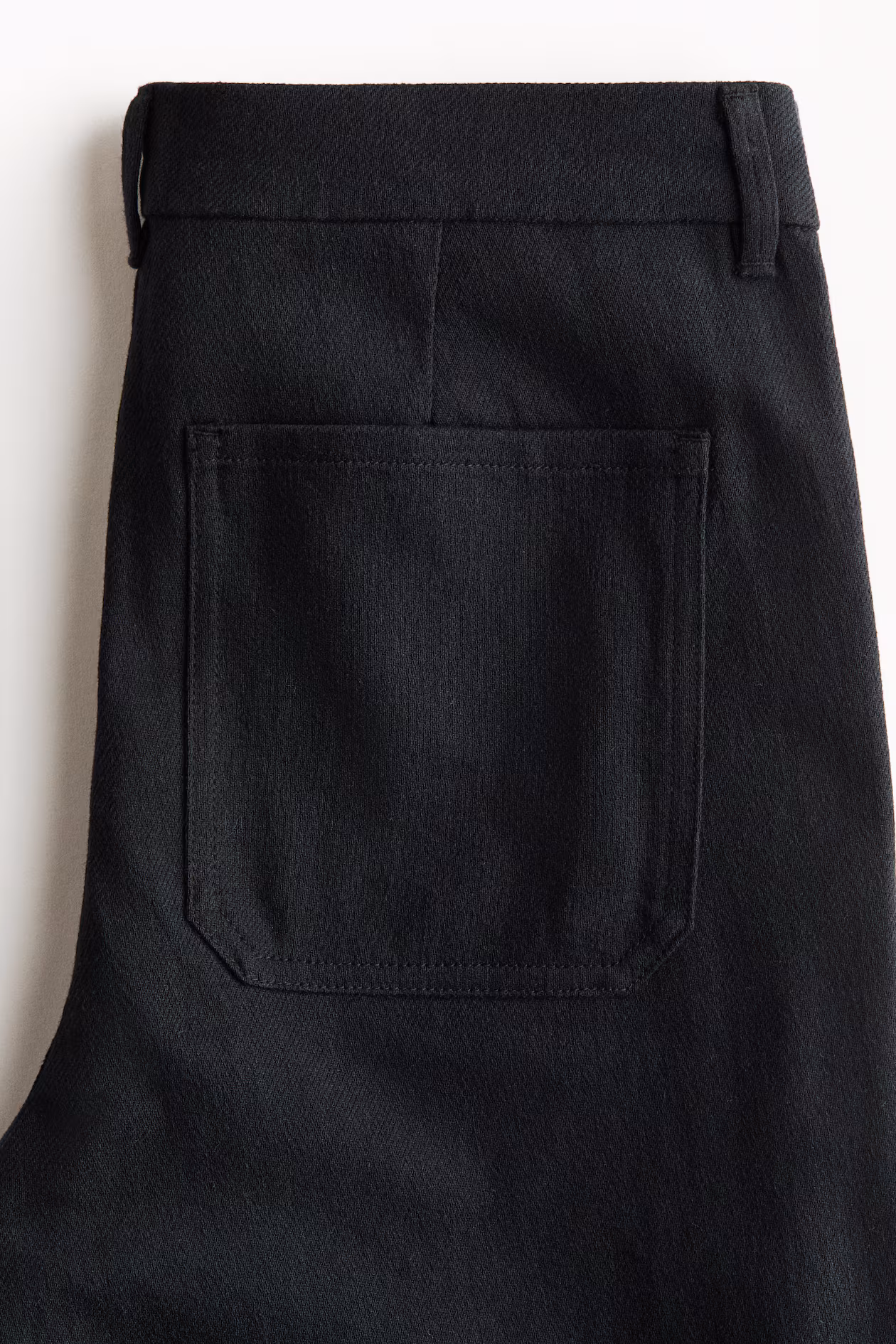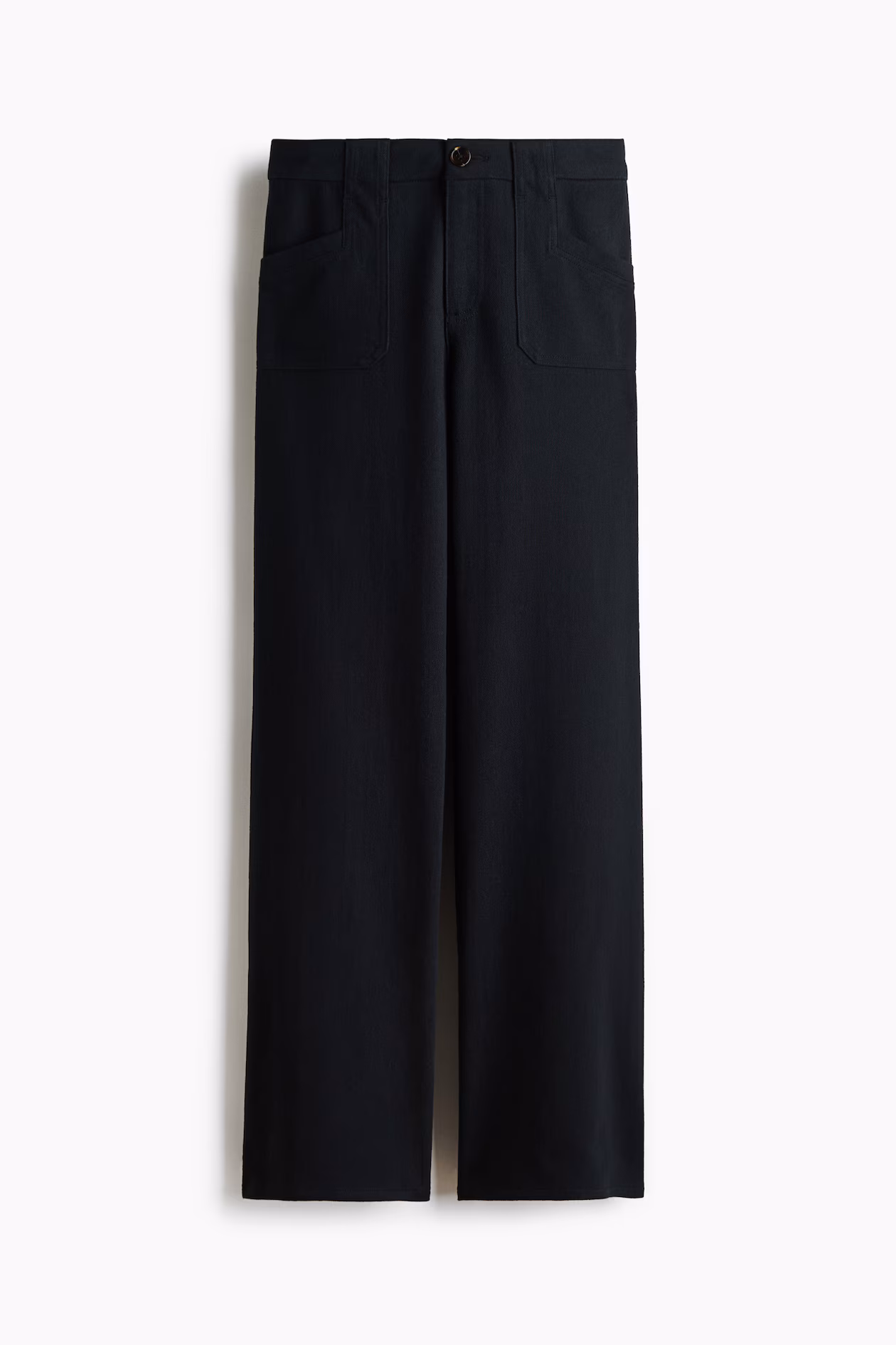 Pants in cotton twill. Zip fly with button, wide belt loops connected to patch front pockets, and patch back pockets. Wide legs.