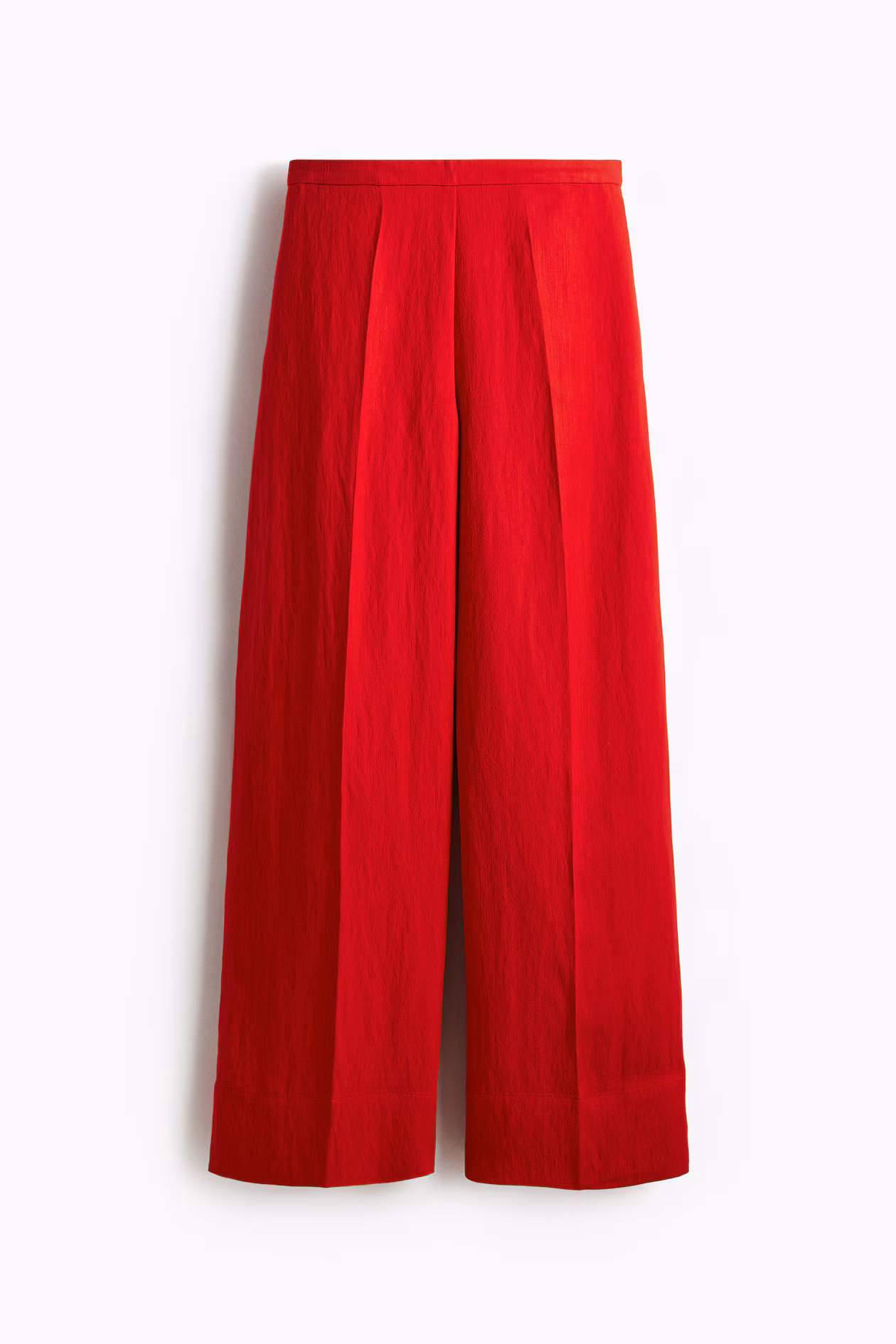 Pants in twill with creases at front and back. High waist, concealed zipper at one side with hook-and-eye fastener, and discreet side pockets. Wide legs.