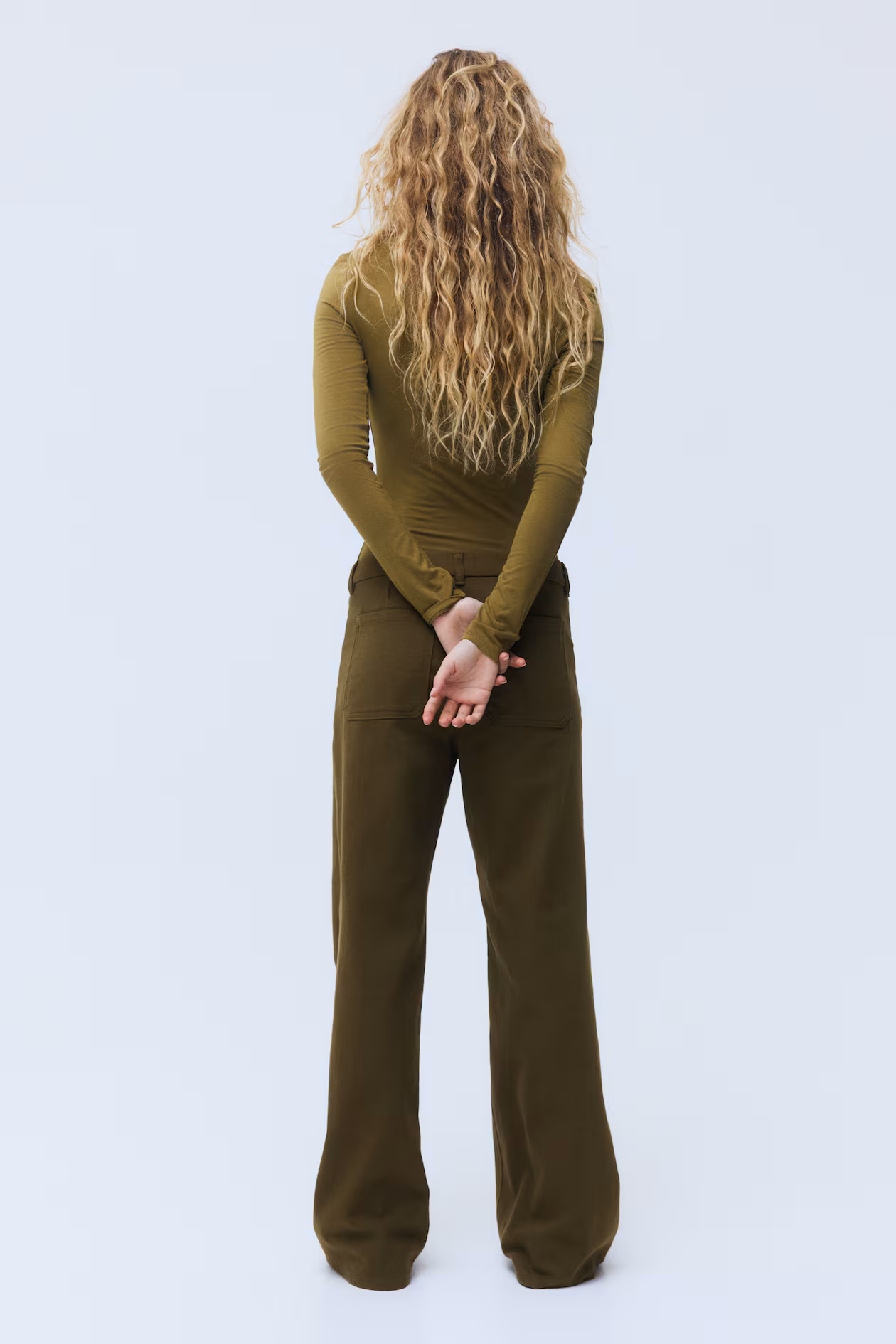 Pants in cotton twill. Zip fly with button, wide belt loops connected to patch front pockets, and patch back pockets. Wide legs.