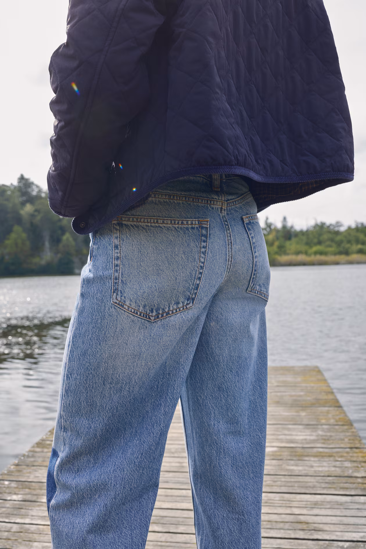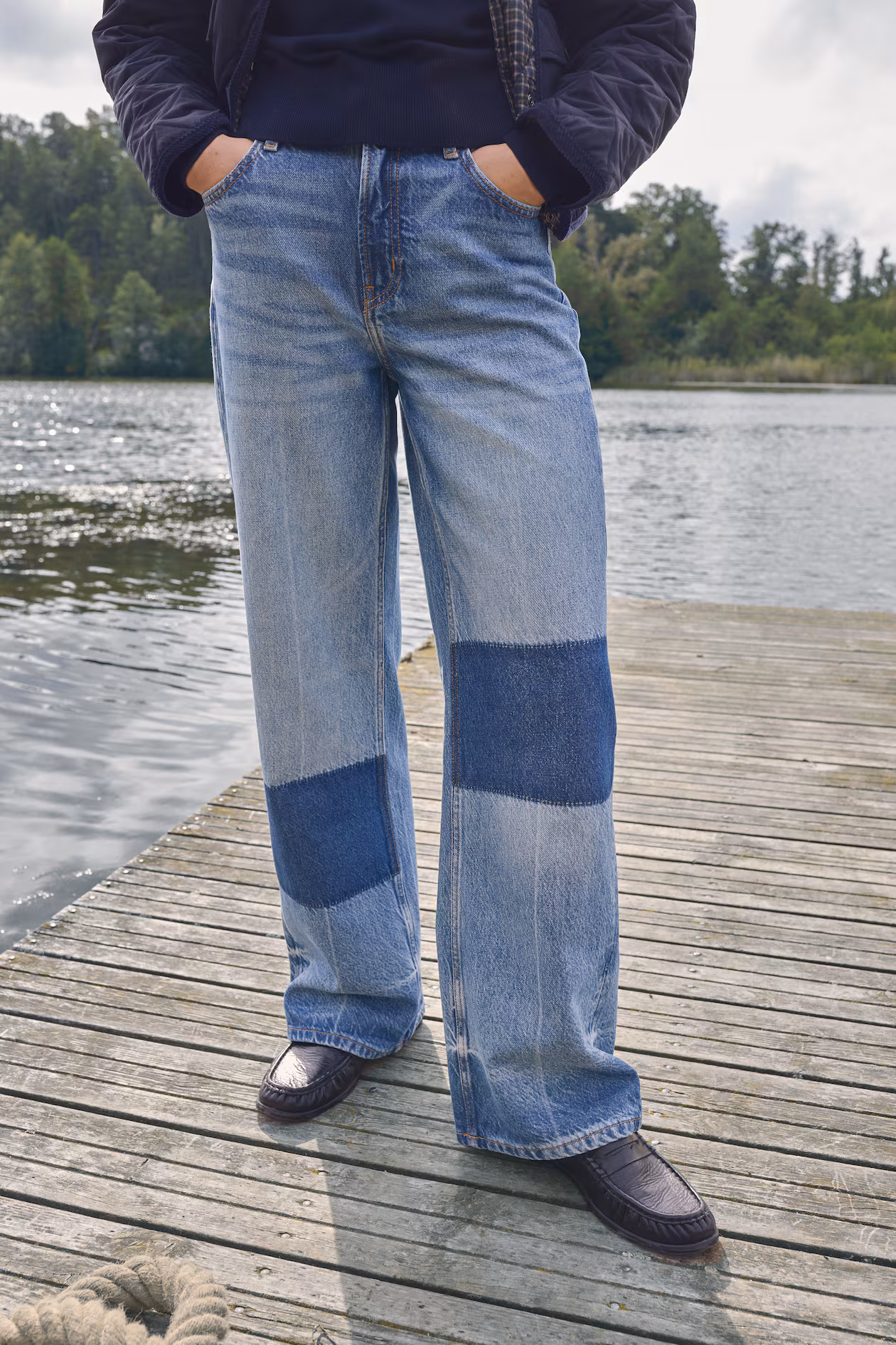 5-pocket jeans with patchwork details. Made from rigid cotton denim that feels firm at first, softening and relaxing with wear. Regular fit from waist to hip and wide cut from thigh to hem. Extra-high waist and zip fly with button. Wide, longer legs, designed to fall over foot with a stacking effect. A wide-cut silhouette that's always flattering.