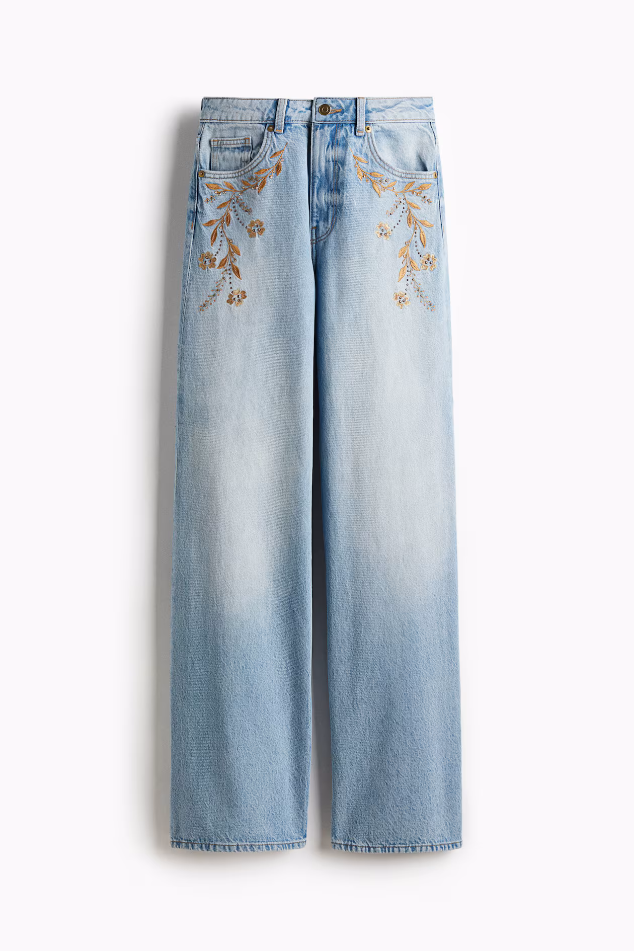 5-pocket jeans in rigid cotton denim that feels firm at first, softening and relaxing with wear. Regular fit from waist to hip and wide cut from thigh to hem. Extra-high waist, zip fly with button, and embroidered details at front. Wide, regular-length legs, designed to fall at top of foot with little or no stacking. Featuring a wide silhouette that's always flattering.