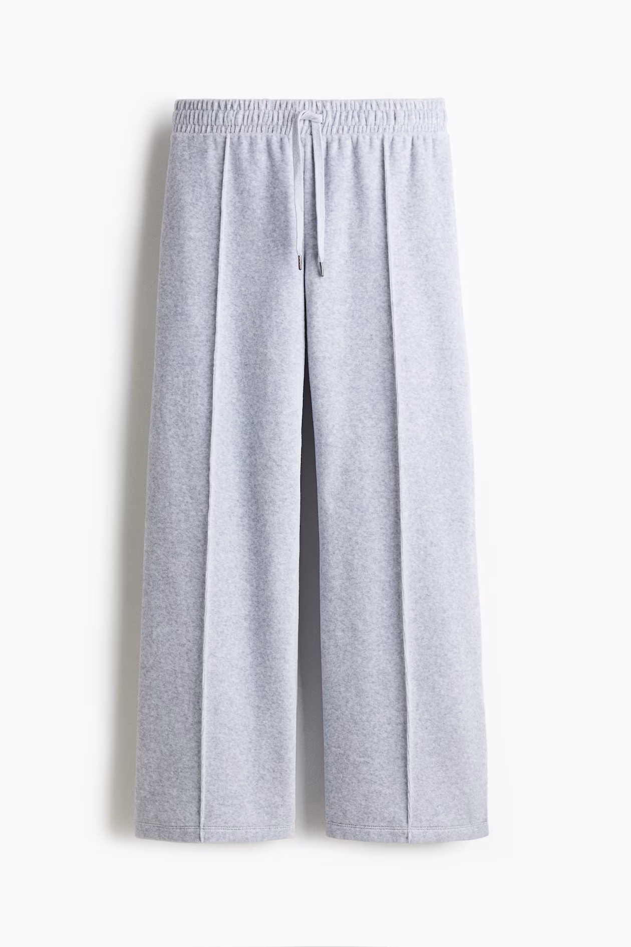 Wide-leg joggers in soft velour with stitched creases at front. Elasticized waistband with drawstring.
