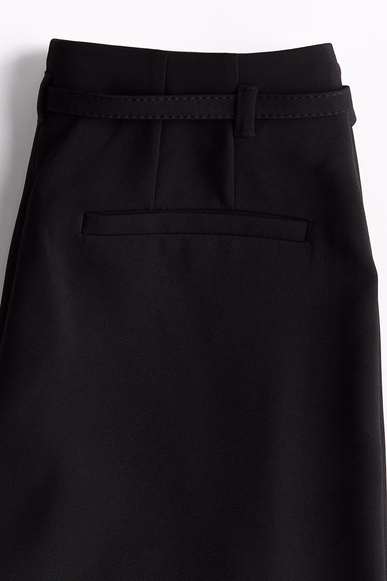 Pants in twill. High waist, waistband with a concealed zipper at one side, and a narrow belt with eyelets and a rectangular, covered buckle. Darts at back, mock welt back pockets, wide legs, and creases at front and back.