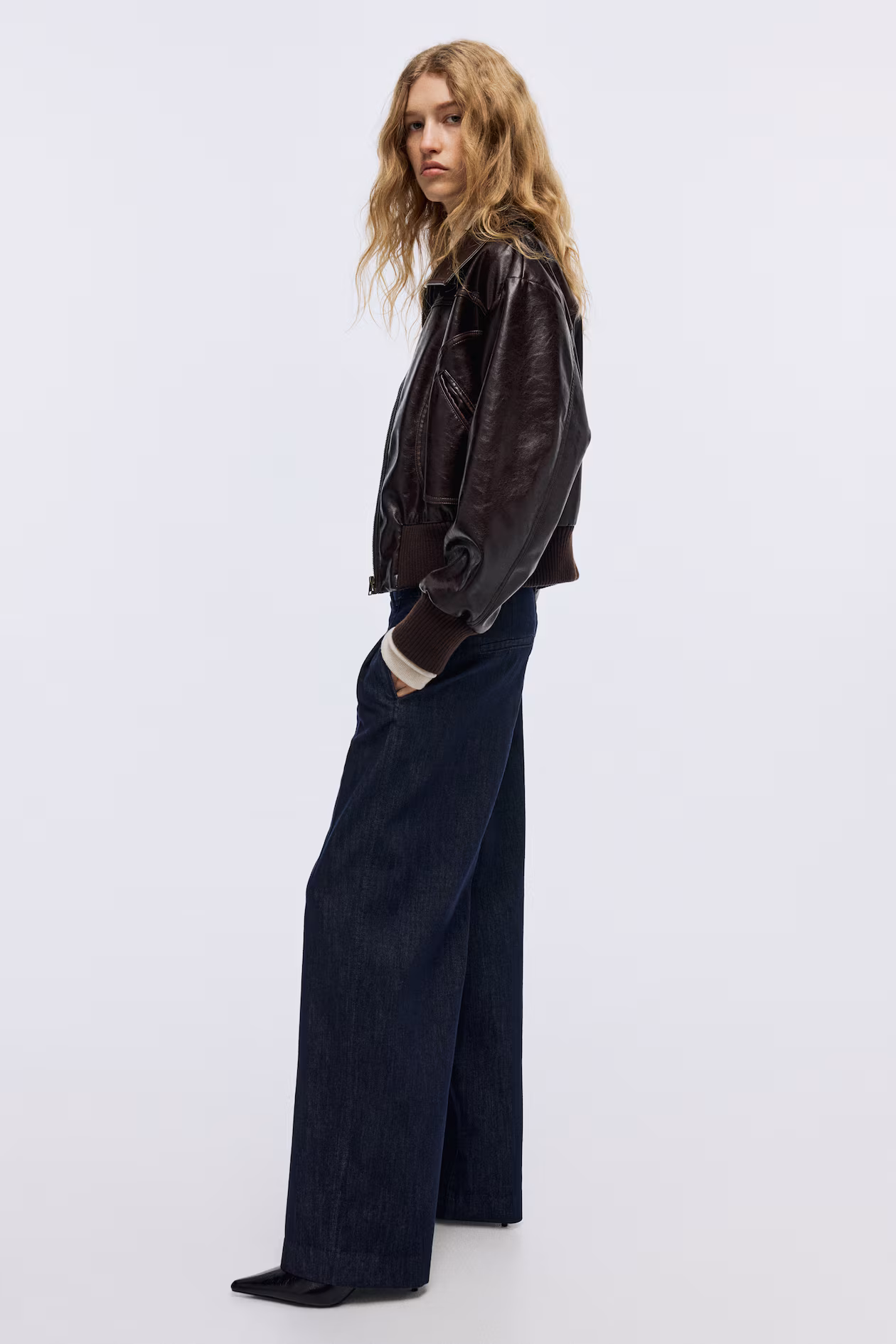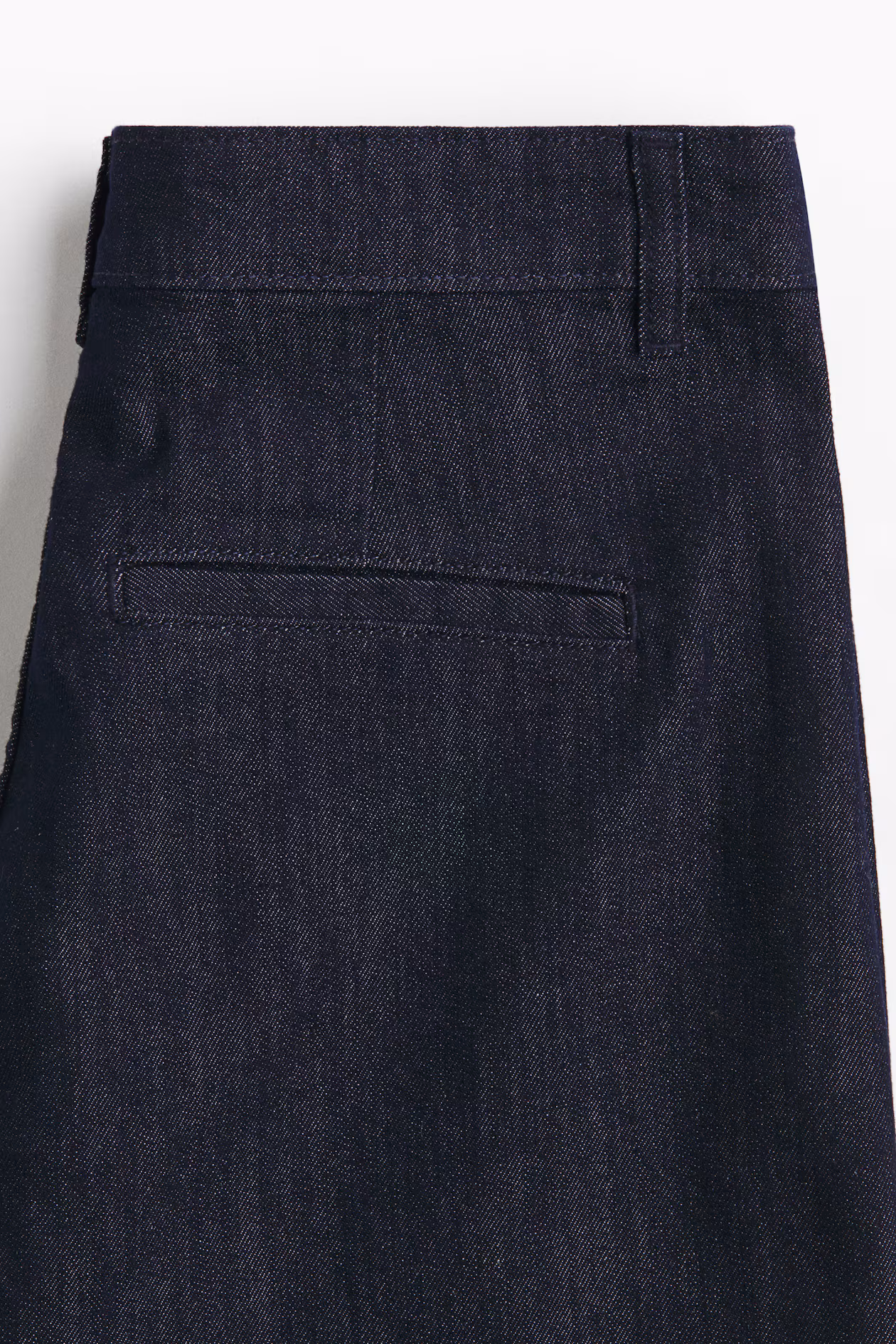 Jeans in denim with gentle stretch for good comfort. Regular fit from waist to hip and wide cut from thigh to hem. Regular waist, pleats at front, zip fly with button, discreet side pockets, and mock welt back pockets. Wide, regular-length legs, designed to fall at top of foot with little or no stacking. The wide-leg jean is a wardrobe essential.