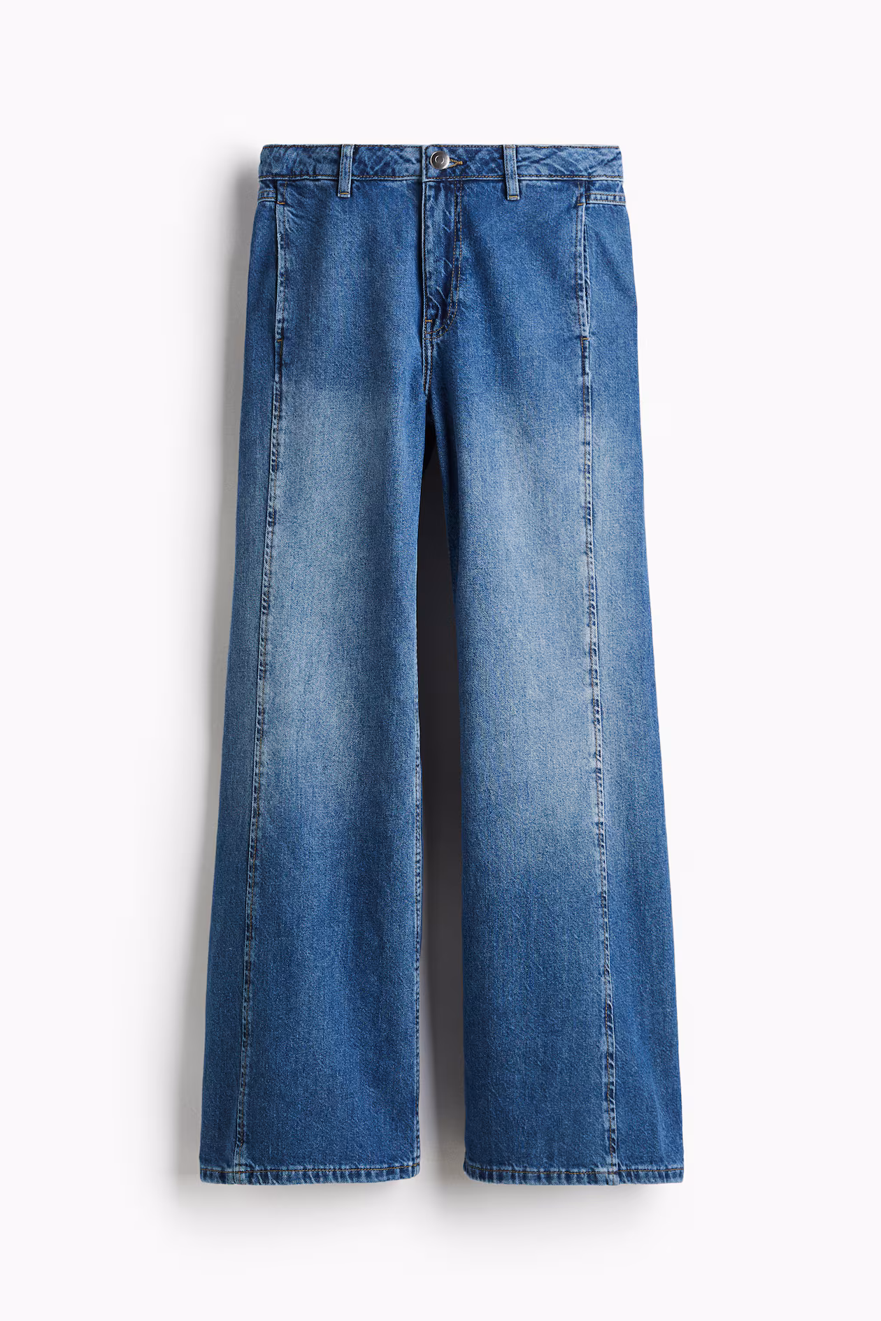 Jeans in rigid cotton denim that feels firm at first, softening and relaxing with wear. Regular fit from waist to hip and wide cut from thigh to hem. Regular waist, zip fly with button, discreet side pockets, and open back pockets. Forward-facing side seams. Wide, regular-length legs, designed to fall at top of foot with little or no stacking. A denim statement that goes the distance.
