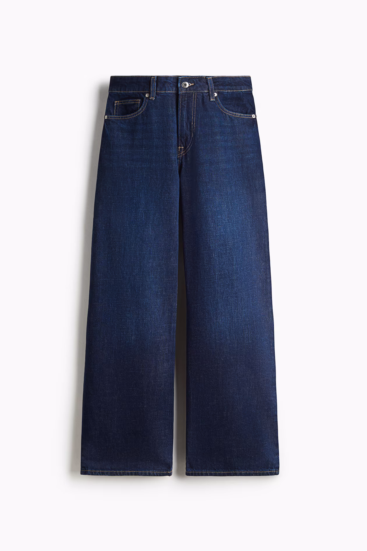 5-pocket jeans in rigid cotton denim that feels firm at first, softening and relaxing with wear. Regular fit from waist to hip and wide cut from thigh to hem. Regular waist and zip fly with button. Wide, longer legs, designed to fall over foot with a stacking effect. The wide-leg jean is a wardrobe essential.