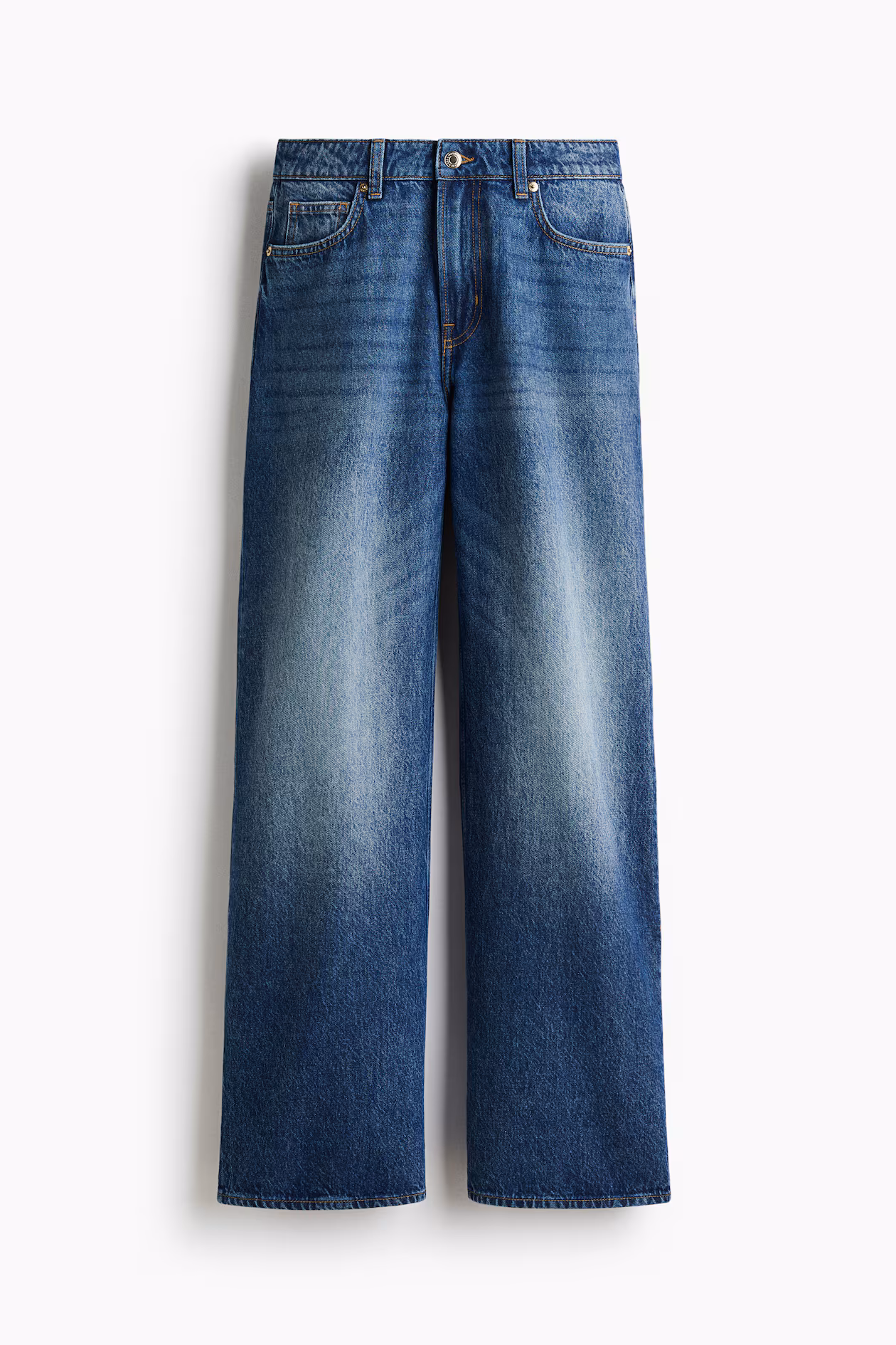 5-pocket jeans in rigid cotton denim that feels firm at first, softening and relaxing with wear. Regular fit from waist to hip and wide cut from thigh to hem. Regular waist and zip fly with button. Wide, longer legs, designed to fall over foot with a stacking effect. The wide-leg jean is a wardrobe essential.