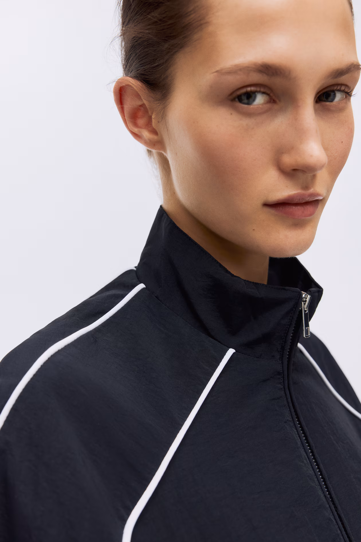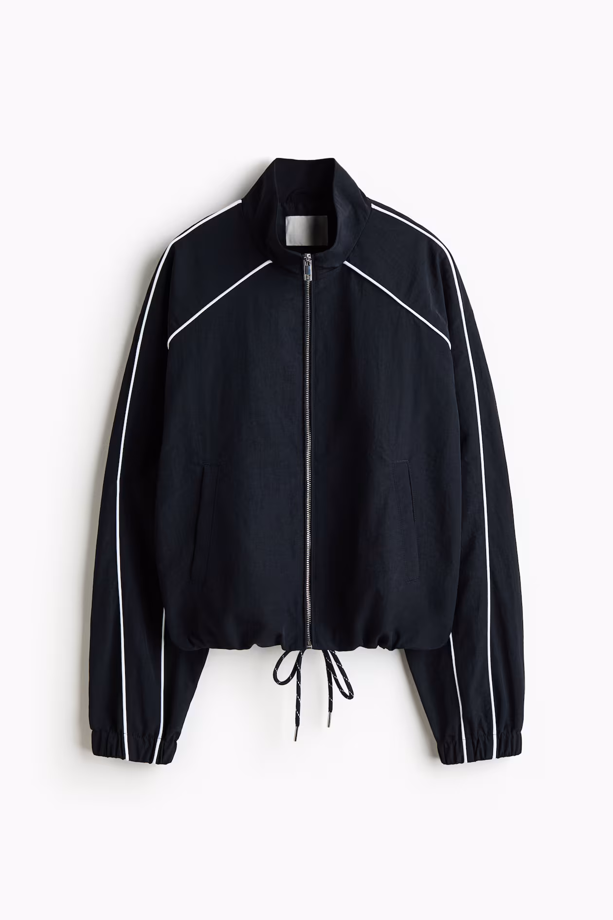 Windbreaker in nylon with contrasting piping. Stand-up collar, zipper at front, and welt side pockets. Long sleeves, covered elastic at cuffs, and drawstring at hem. Lined.