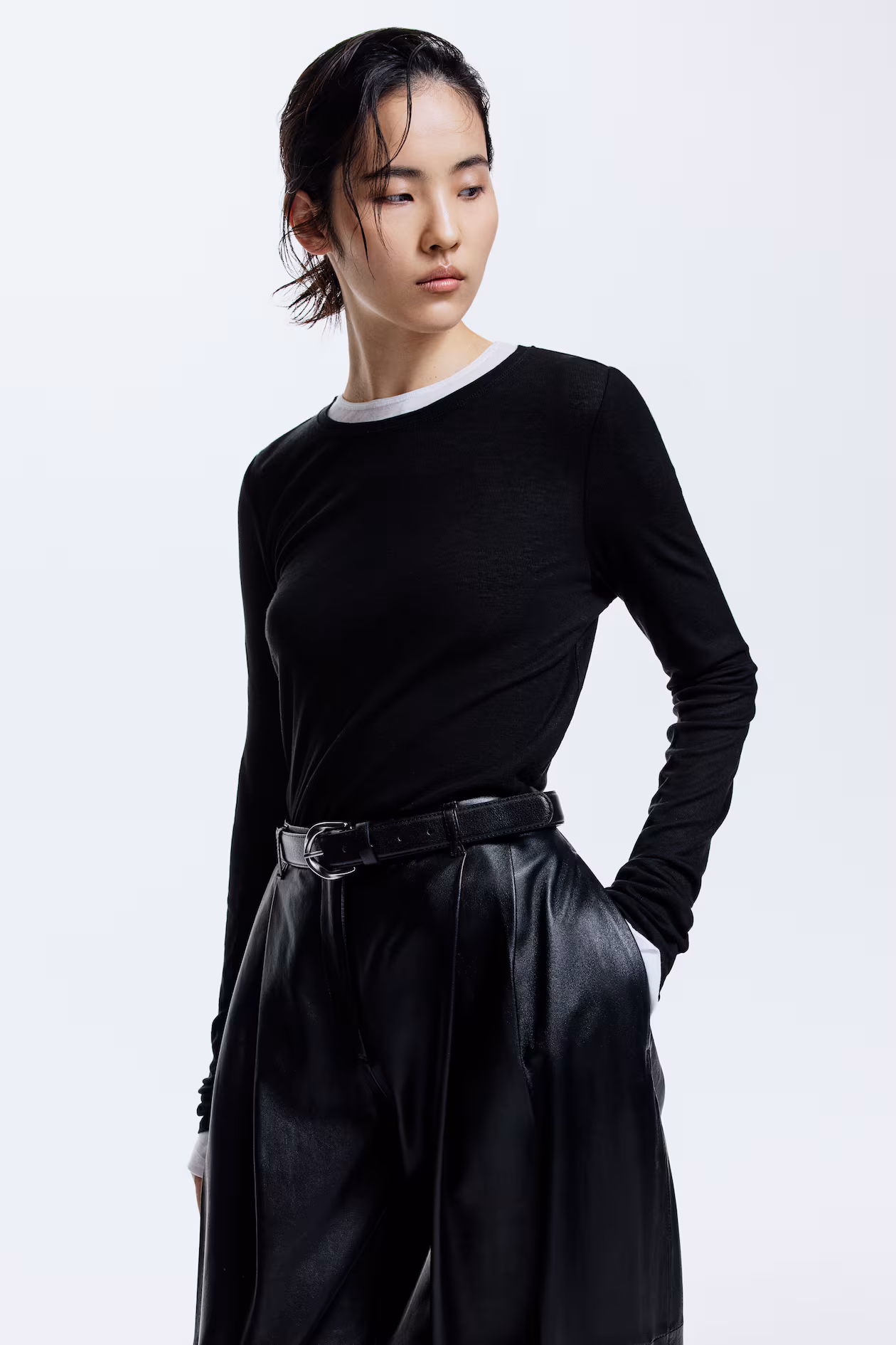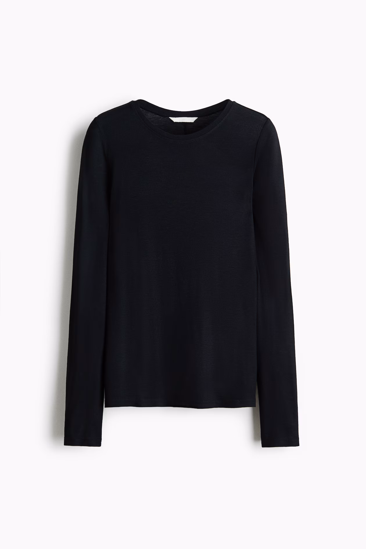 Fitted top in a sheer, rib-knit wool and viscose blend. Round neckline and long sleeves.