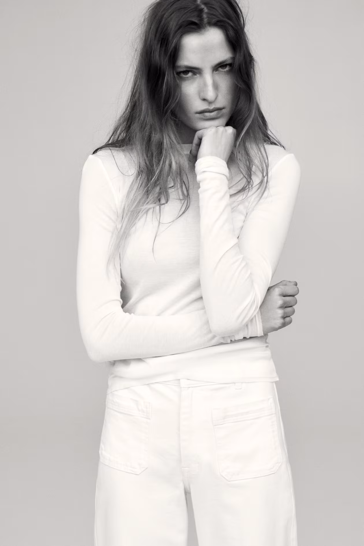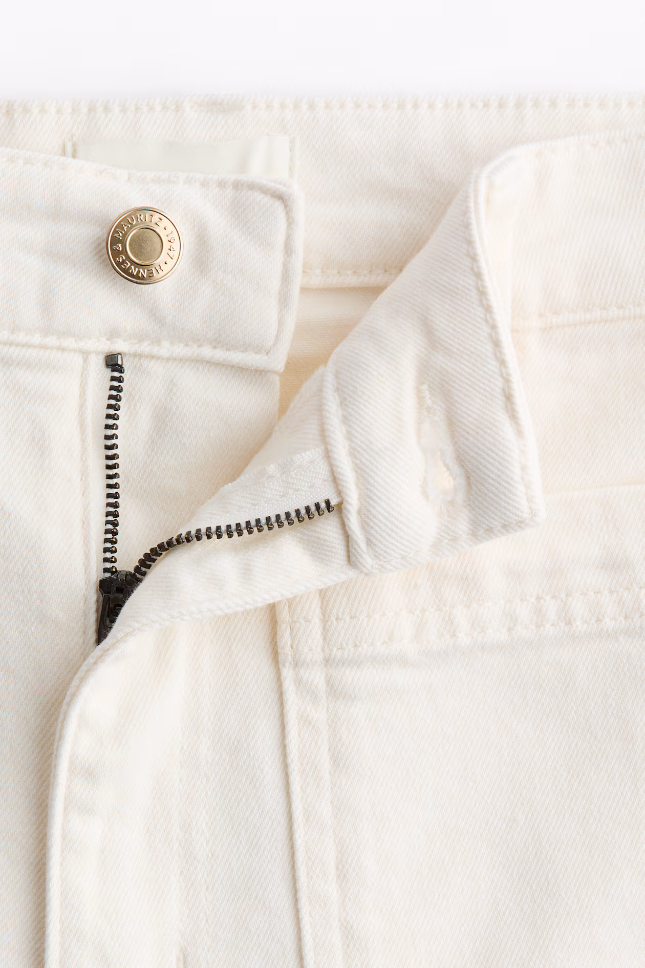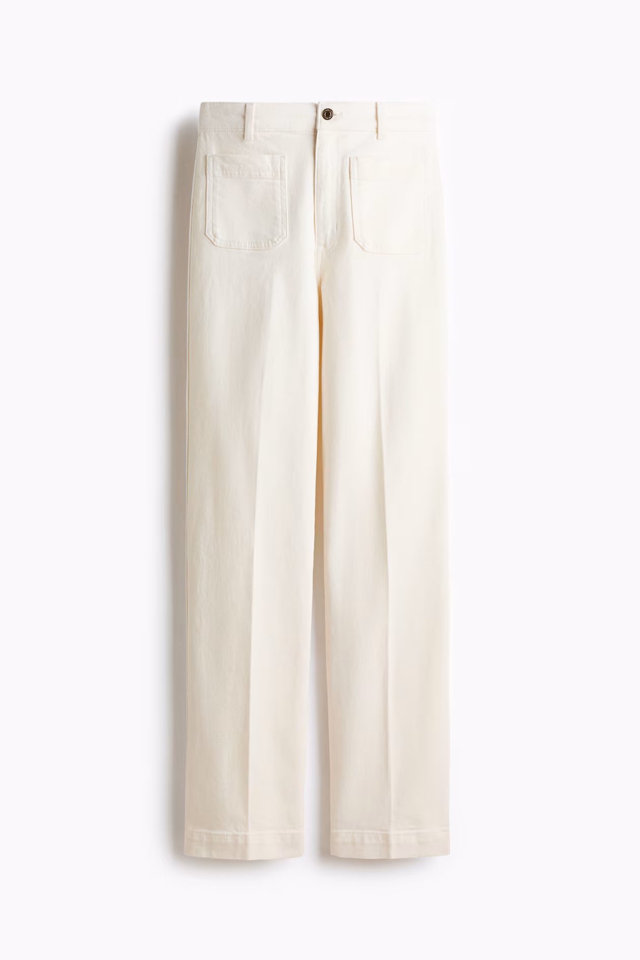 Jeans in cotton denim with gentle stretch for good comfort. Regular fit from waist to hip and wide cut from thigh to hem. High waist, zip fly with button, patch front pockets, and patch back pockets. Creases at front and back. Wide, regular-length legs, designed to fall at top of foot with little or no stacking. Effortlessly flattering no matter how they're styled.